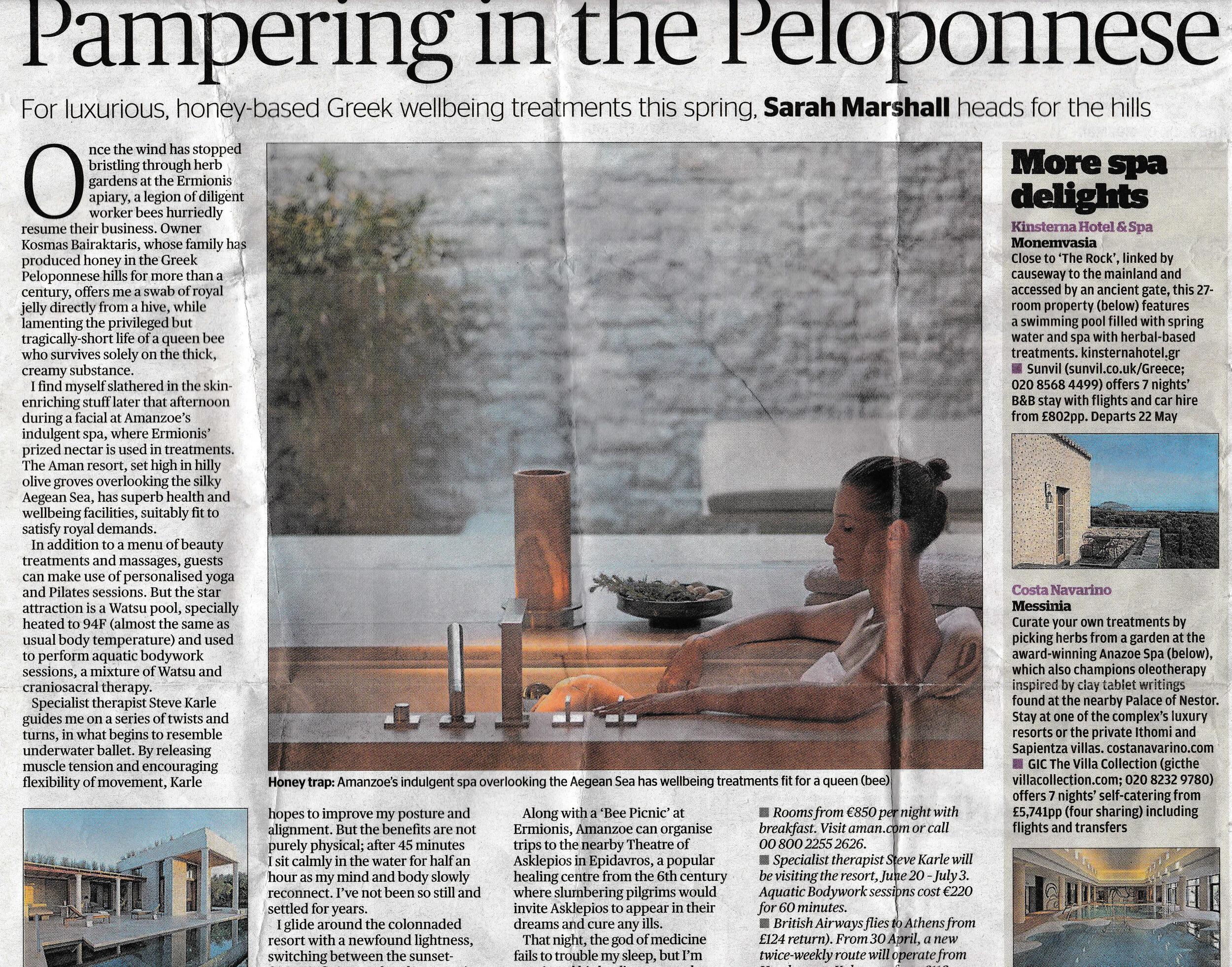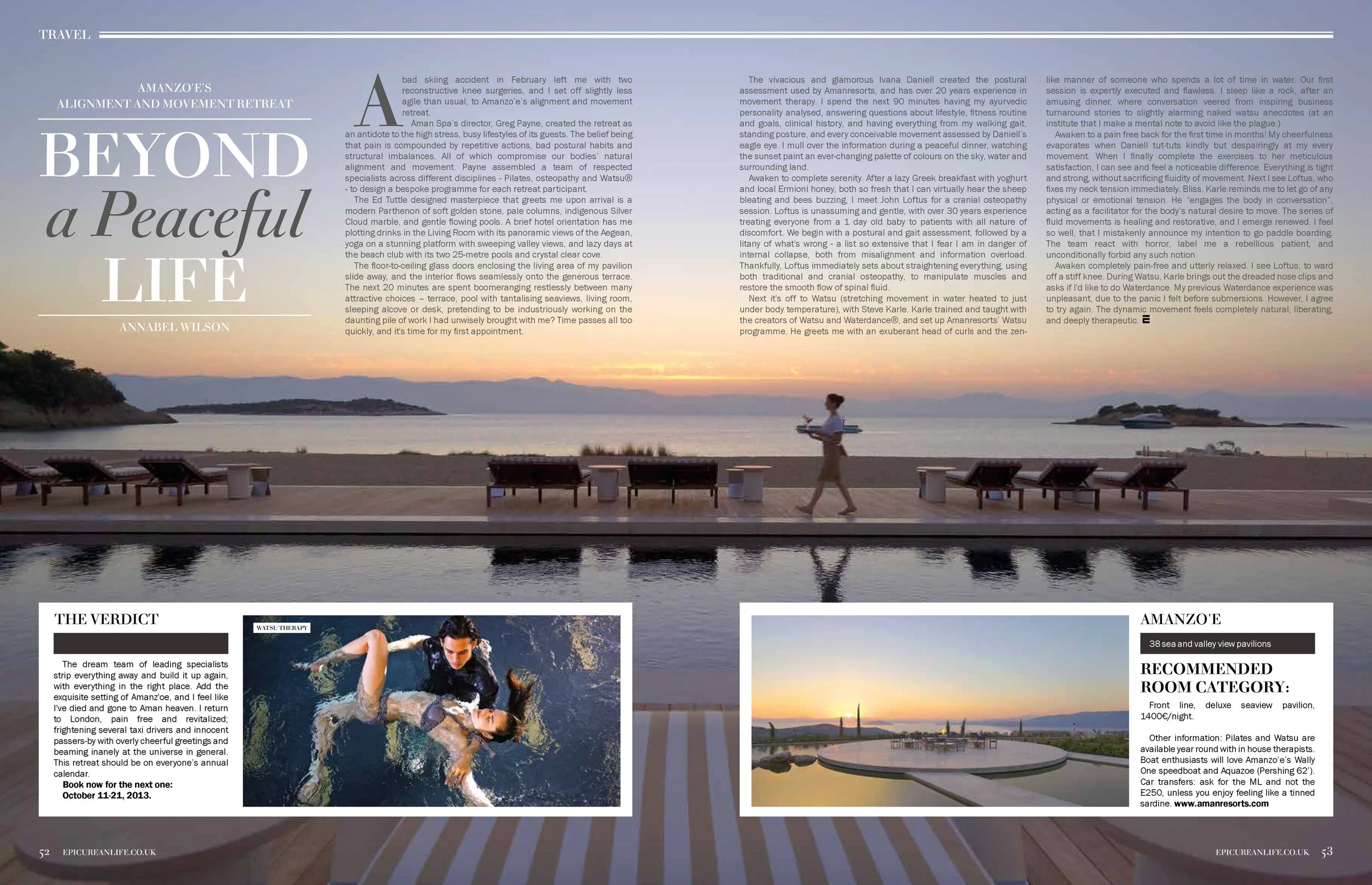 “Amanzoe’s Spa speciality is a gentle, water-based body therapy. All therapists are taught by aquatic bodywork specialist Steve Karle.”